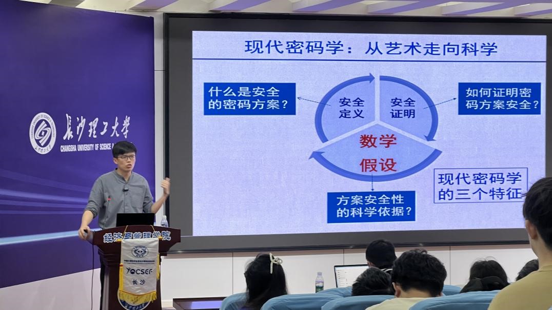5月27日上午,计通学院在金盆岭校区12教200教室举办了主题为“现代密码学研究入门”的讲座。本次讲座由国防科技大学计算机学院副研究员、博士生导师陈荣茂担任主讲嘉宾,计通学院副院长蔡烁、计通学院团委副书记余泽宇出席讲座,计科专业部分同学参加讲座。