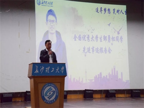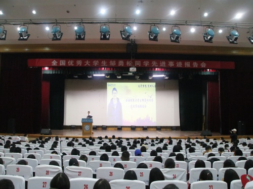 2018年10月16日下午在金盆岭校区五教大礼堂举行了全国优秀大学生邹勇松同学先进事迹报告会。副校长谈传生,校党委委员、宣传部部长方琼,学工部(处)负责人和相关学院学生工作负责人及千余名2018级新生参会。