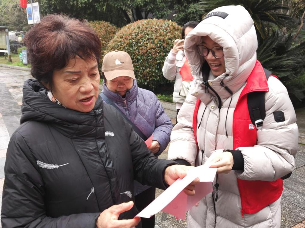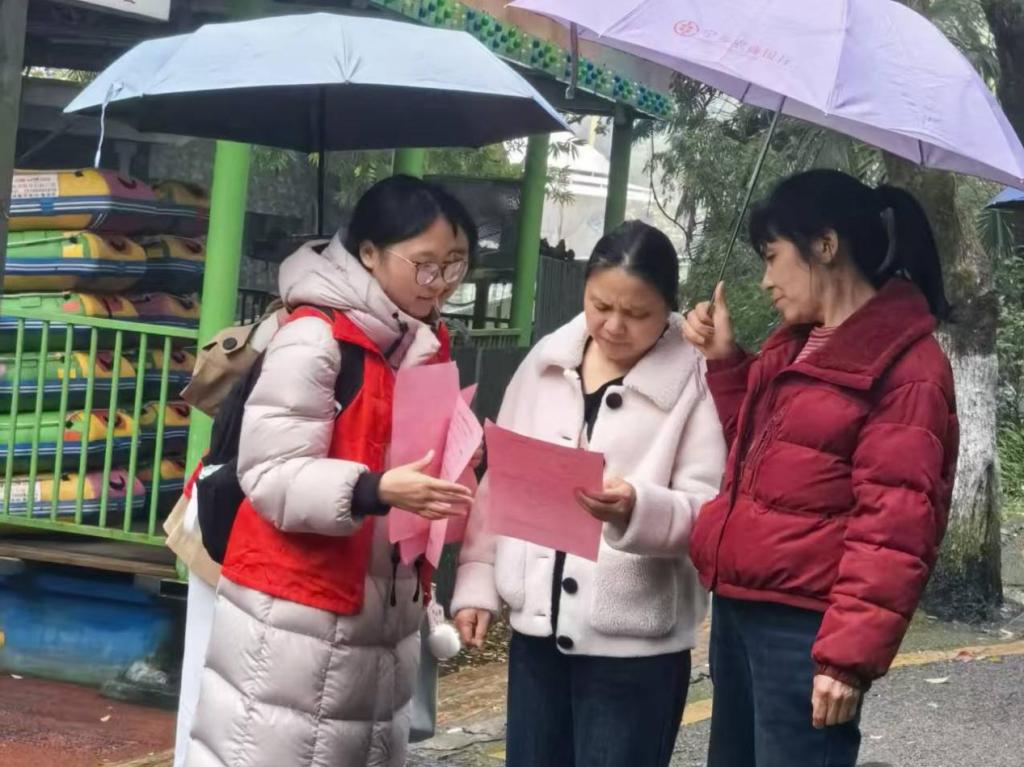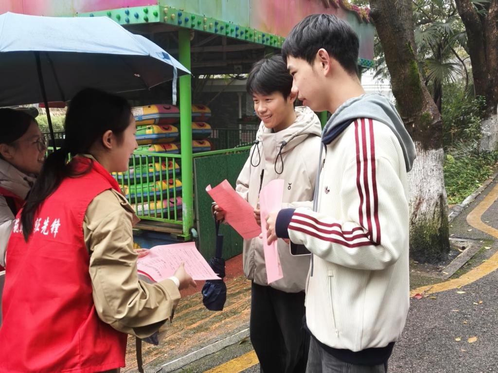 在周边居民集中的南郊公园,同学们穿梭于林荫步道与休闲广场之间,向游园、遛娃的市民发放反诈宣传单,耐心讲解养老诈骗、刷单返利等高发骗局的识别方法,雨水打湿了衣襟,却浇不灭普法团成员们的服务热情。为了拉近距离、增强互动,成员们还特意准备了棒棒糖、气球等小礼物,赠送给现场的小朋友们,有效提升了大家的参与积极性。大家被志愿者们的热情所感染,接过传单后连连道谢,有的还主动分享自己遇到的疑似诈骗经历,与志愿者们交流讨论。细雨之中,这份真诚的互动更显温暖。