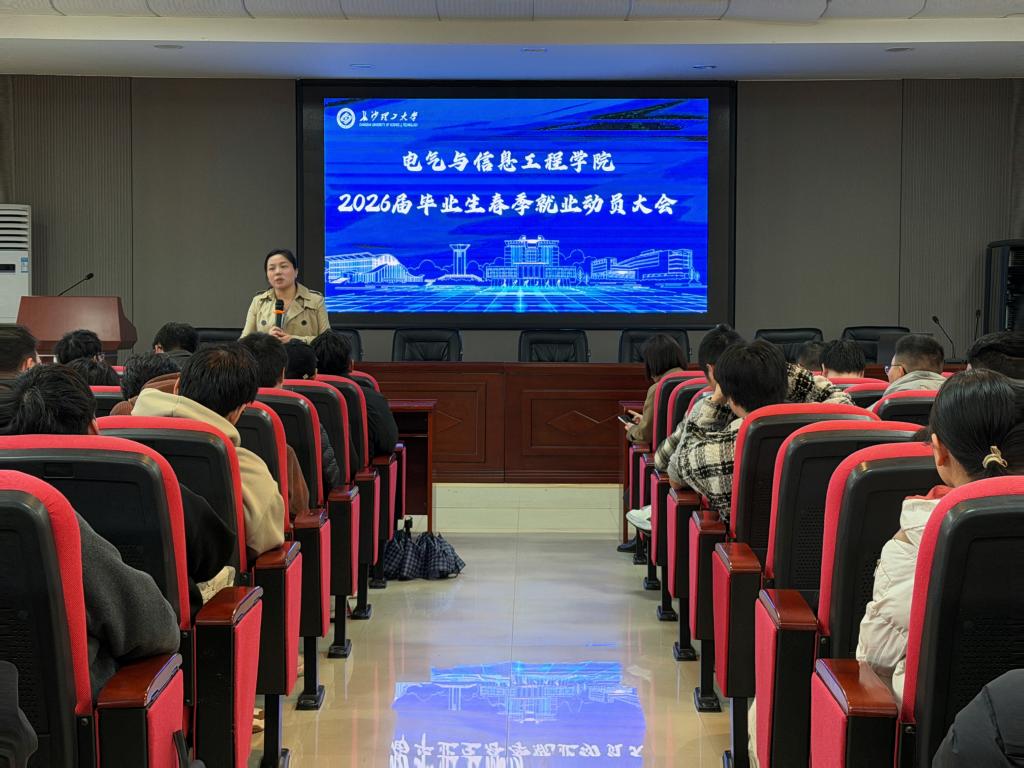 4月3日上午,电气学院2026届毕业生春季就业动员大会在工一B503召开,学院党委书记丁丹、党委副书记周巍、毕业班辅导员楚艳鸽、吴佳骐出席会议。
