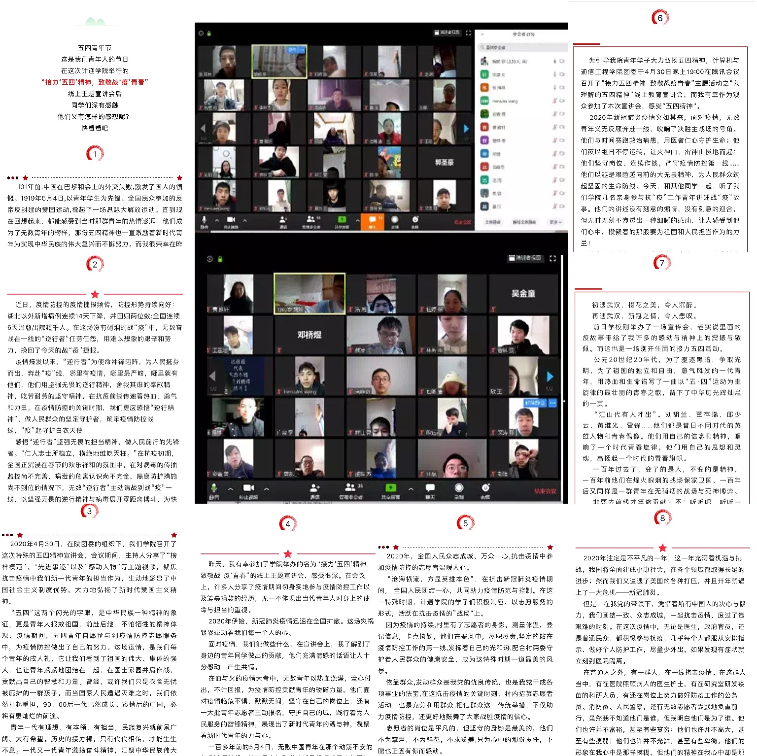 “从小到大,从思想品德课到形势政策课,从思修到毛概,理论课让我们对信念理解更全面,但这次疫情作为一线志愿者,看着警察叔叔,社区工作人员夜以继日的付出,看着医护人员毫无畏惧的勇敢逆行,让我更生动的理解了信念的含义。”这是水利工程学院云端宣讲会1601班的陈嘉德的感言。五四期间,学校开展线上“我理解的五四精神”云端宣讲会30余场,通过挖掘身边的模范榜样和感人战疫故事,使同学们对于抗疫精神有了更深刻的理解,对五四精神有了新的诠释。“在疫情当中,有不少青少年积极投入疫情防控的人民战争当中,他们为社区防控、医疗救治付出了艰苦卓绝的努力,用顽强的意志担当起时代责任、表现出了砥砺奋斗的决心。百年五四,百年进步,正是因为有了传承与创新,才能够迎来这个美好的新时代。” 经济与管理学院19级硕士研究生张安宇感言道。