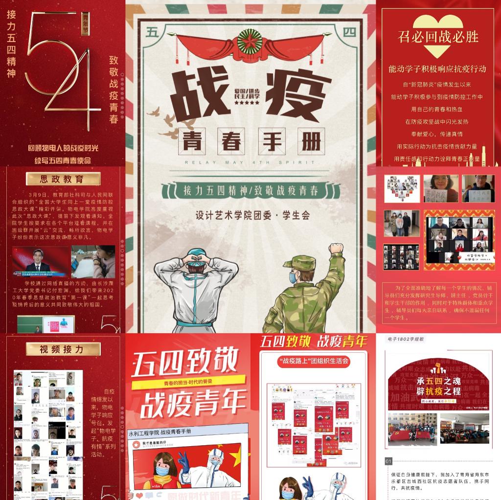 战疫迎五四,奋斗致青春。各学院围绕“接力五四精神 致敬战疫青春”的主题,以“说、唱、写、拍、画”的方式,用大白话讲大道理,用正气歌凝聚正能量。同时,各学院围绕疫情以来那些发生在学生身边的事和人,聚焦抗击疫情中涌现出来的学生典型,通过H5的形式制作《战役青春手册》,通过线上接力的方式,引导更多的团员青年团员自觉践行五四精神,坚定理想信念,站稳人民立场,练就过硬本领,投身建国伟业。