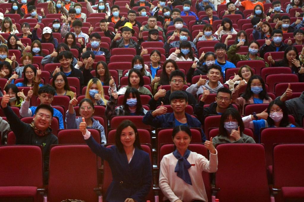 刘洁从心理关、语言关、知识关和国际关四个方面阐释如何提升国际表达力。她强调要重视平时的积累,了解祖国的历史和现在,关注世界的发展,这样才能在广阔的国际舞台发出中国好声音。互动环节,刘洁邀请四位同学上台展示,共同演绎她在网络上走红的作品We are all fighters配音。同学们勇敢的发声、自信的表达,让更多同学相信自己的发声可以改变世界。