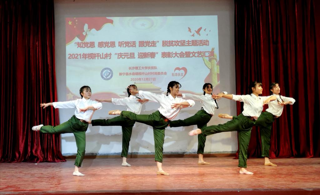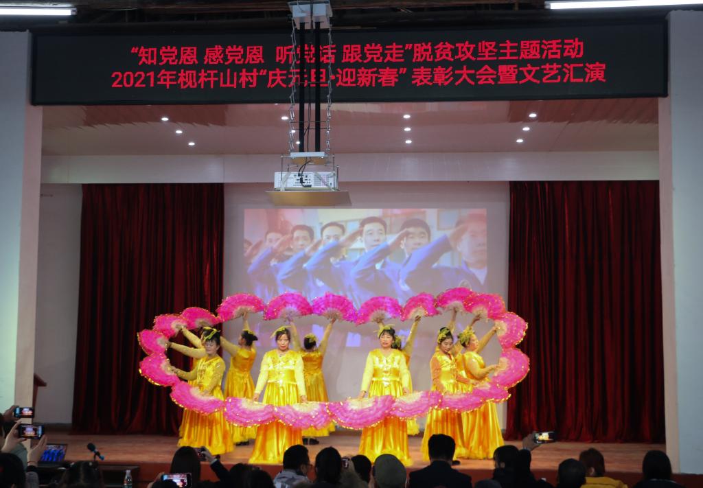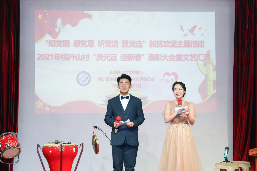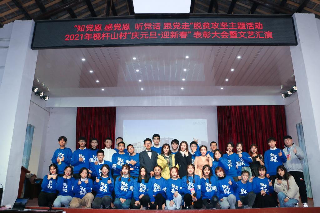 12月27日上午,在威廉体育扶贫点枧杆山村文化大礼堂,500多名村民欢聚一堂,隆重举行2021年“庆元旦•迎新春”表彰大会暨文艺汇演活动。保卫处副处长黄伟,校团委副书记陈璐莎、素质教育办公室主任万馨以及阳光艺术团、阳光radio34名学生受邀参加活动。