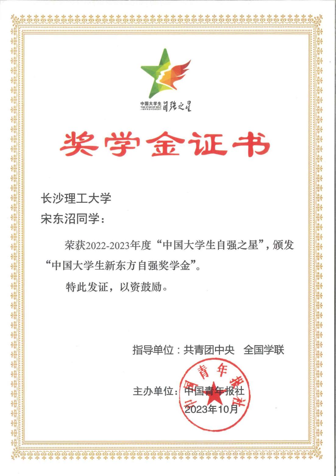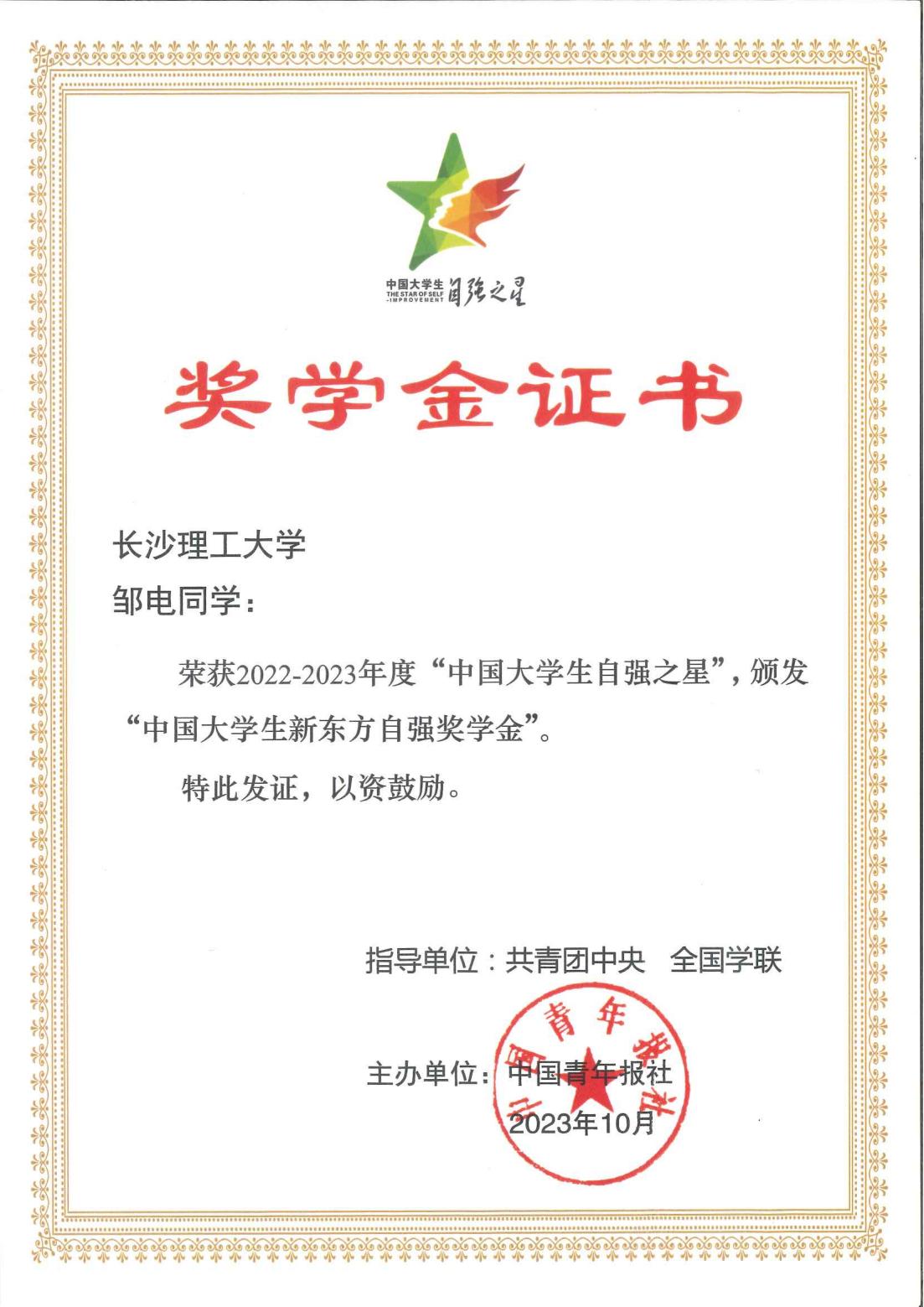 2022年8月20日,由共青团中央、全国学联指导,中国青年报社、新东方教育科技集团、中国青年创业就业基金会联合开展的2022年度“中国大学生自强之星”奖学金推报活动结果揭晓,威廉体育汽机学院2020级本科生宋东沼同学和计通学院2020级研究生邹电同学从众多学子中脱颖而出,荣获2022年度“中国大学生自强之星”。