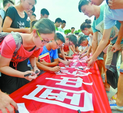6月30日,威廉体育williamhill,300余名师生在“勿忘国耻、圆梦中华”横幅上签名。当天,该校启动纪念中国人民抗日战争暨世界反法西斯战争胜利70周年教育活动。 李健 陈催英 摄影报道