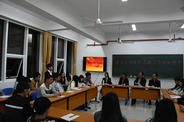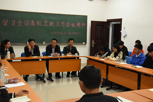 4月17日晚七点半,校党委书记付宏渊来到材料学院“责任与担当”主题班会的现场,并向所联系班级——无机1603班解读“学习全国高校思想政治工作会议精神”。材料学院党委书记张国强、该班班主任陈召勇和辅导员唐青参加了班会。