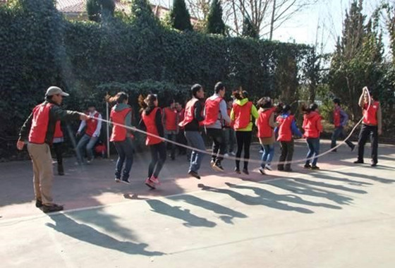 A组(十人集体跳):12人为一队进行集体跳绳。2名摇绳运动员,10名参跳运动员(5男5女)站在跳绳一侧,时间限制3分钟,统计3分钟内全员跳绳成功次数。