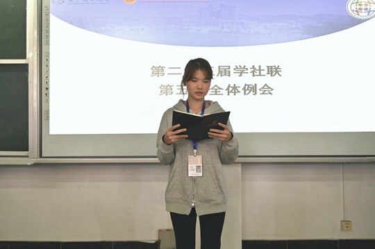 威廉体育williamhill第二十三届学生社团联合会(以下简称学社联)第五次全体例会于11月30日上午10:00在金盆岭校区十二教500召开,学社联主席团与各部门成员与会。