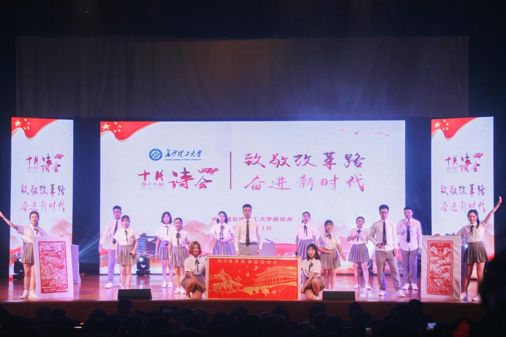 “我在等一阵风来/在等它拨开盘踞在天边的阴霾…”诗会在外国语学院的《等风来》中拉开了序幕,回顾改革开放之路的艰辛;土木学院《龙起遨程》领略了龙翔九天披荆斩棘的归途,亦让我们听到了祖国锦绣山河的梦想,一品心中的感慨与豪迈;交通学院《改革开放路,大道行思远》一路前行,展示了交通青年奋勇前行的魄力;艺术学院《在路上》让我们肩负光荣使命,怀揣梦想携手向前;化学学院《大道至简,光荣之路》向我们展示了一条中国特色社会主义的光荣之路;汽机学院《初心》不忘初心牢记使命,为实现祖国富强而努力奋斗。