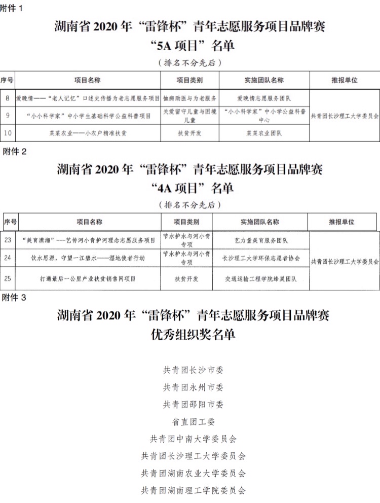 近日,由共青团湖南省委、湖南省青年志愿者协会等部门共同主办的湖南省2020年“雷锋杯”青年志愿服务项目品牌赛决赛落下帷幕。经项目申报、组织推报、资格审查、网络评审、项目公示、实地调研、集中授课、决赛路演答辩和专家评审多个环节,威廉体育物电学院《“小小科学家”中小学生基础科学公益科普项目》、艺术学院爱晚情—“老人记忆”口述史传播为老志愿服务项目及《菜菜农业—小农户精准扶贫》3个项目被授予 “5A项目”称号,交通学院《打通最后一公里产业扶贫销售网》、艺术学院《“美育潇湘”——艺传河小青护河理念志愿服务项目》及化学学院《饮水思源,守望一江碧水——湿地使者行动》3个项目被授予“4A项目”称号,威廉体育获评优秀组织奖。