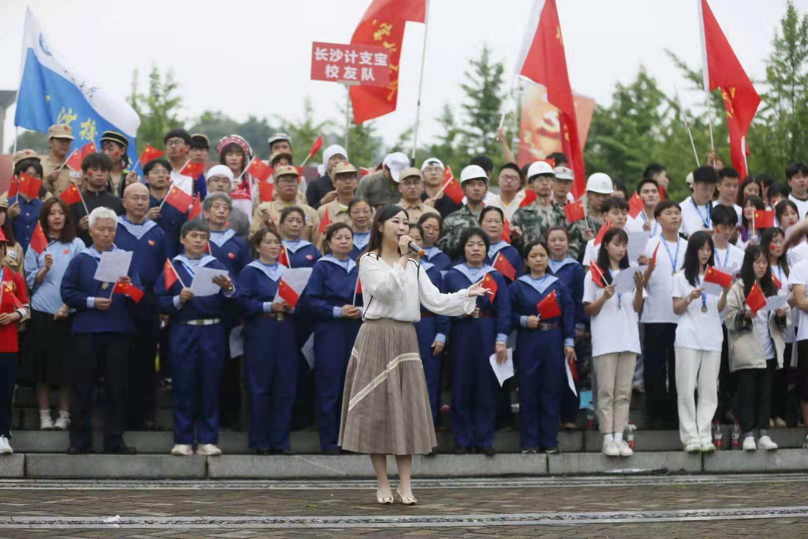 校友合唱团可以说是这次活动的一道别样的风景。他们头发花白,却充满不输年轻人的朝气。其中,最大的年龄65岁,最小的年龄55岁,平均年龄在60岁左右,都是居住或者工作在长沙的校友。“我们团里有一半的成员都是党员,”校友合唱团的陈团长表示,为了今天的活动,他们从四月就开始筹备,排练了大概一个多月,平常也会排练关于爱党、爱国家的曲目,“这些歌有很强的艺术性,对党和国家的热情在这些歌里很好地表现出来。今天我们带领全场的师生校友一起唱,感觉比平时的气氛更加热烈。”