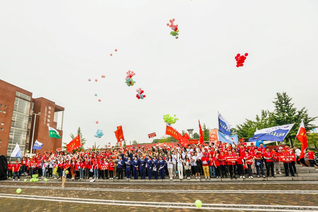 上午8点半,全校各学院师生、部门职工及校友组成的83支队伍齐聚田径场整装待发,整齐有序,队旗飘扬。