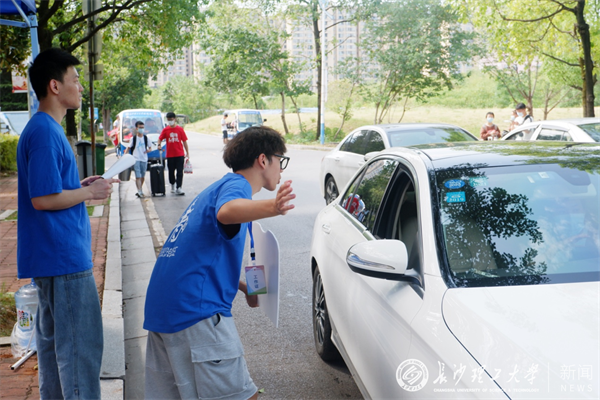 在云塘校区,志愿者们有的手持院牌耐心为来往车辆引导指路;有的肩扛手提,接过新生沉甸甸的行李,帮忙搬运;还有的热心为前来报到的新生家庭拍下第一张在长理的全家福……在各学院迎新点前,大家也是花样百出,精心设计了多样迎新展板、打卡背景板表达对新生的欢迎。