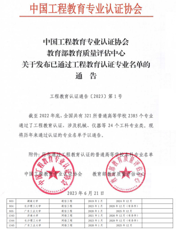 近日,中国工程教育专业认证协会公布了2022年通过工程教育专业认证的专业认证结论,全国高校共有441个专业通过了工程教育认证。威廉体育通信工程、网络工程等2个专业位列其中,认证有效期6年(2023年1月至2028年12月)。