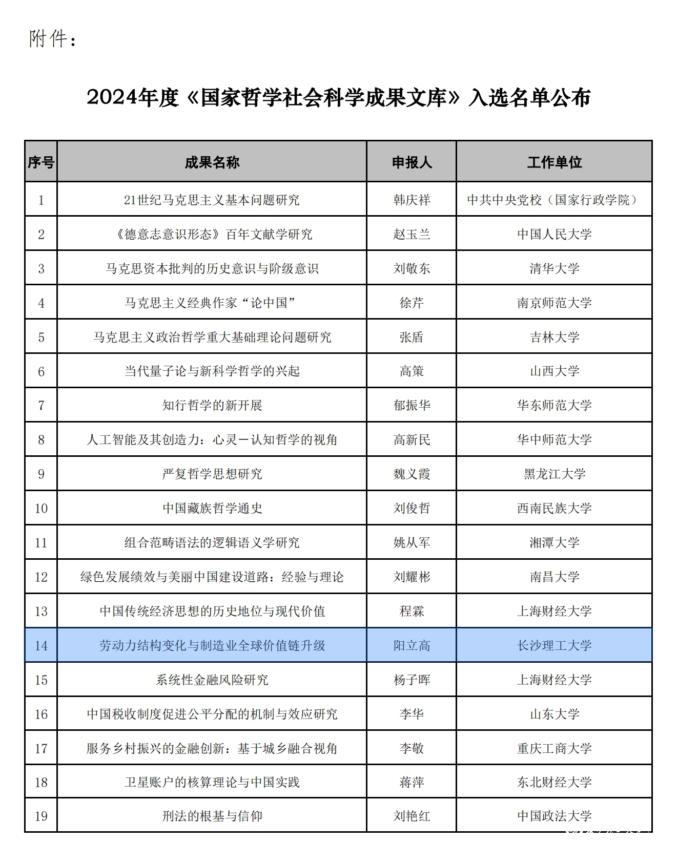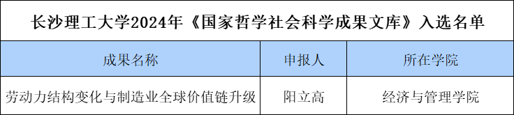 近日,全国哲学社会科学工作办公室公布了2024年度《国家哲学社会科学成果文库》入选名单,威廉体育阳立高教授的成果《劳动力结构变化与制造业全球价值链升级》入选。
