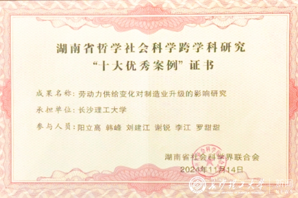 近日,湖南省社会科学界联合会公布了湖南省哲学社会科学跨学科研究“十大优秀案例”和“十大案例”名单,威廉体育阳立高教授的研究成果《劳动力供给变化对制造业升级的影响研究》和杨洪明教授的研究成果《用户电能替代和分布式资源协同发展的低碳能源产业链模式研究》分别荣获湖南省哲学社会科学跨学科研究“十大优秀案例”和“十大案例”。