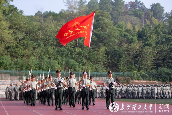 在庄严肃穆的氛围中,全体参会人员向冉冉升起的国旗行注目礼,共唱国歌。随后,气势恢宏的红旗舞、破锋八刀、匕首操等特色方阵依次上场,现场红旗招展掌声雷鸣,经久不息。伴随着慷慨激昂的《分列式进行曲》来自22个学院的142支新生方队昂首阔步通过主席台,他们军姿挺拔、士气高昂、目光如炬,充分展现了军训的扎实成果新时代大学生朝气蓬勃的精神风貌。