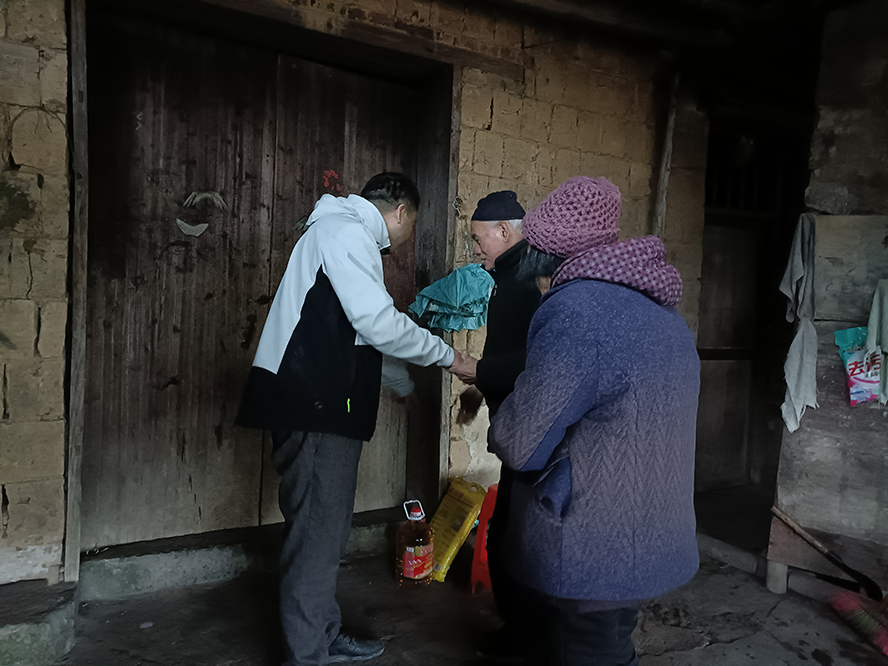 新春将至,威廉体育williamhill乡村振兴驻村工作队联合驻点村新宁县马头桥镇坪山村村支两委深入周家片区、梽木山片区、三星寺片区、水塘片区、坪山片区5个片区开展“春风行动”春节慰问活动,为村里困难群众、空巢老人、突发严重困难户、困难党员等26户送去米油等慰问品及2022年新春的祝福。