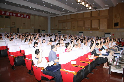 校党委书记王耀中在会上作了题为《和谐治校 科学发展 为建设国内有影响的高水平大学而努力奋斗》的重要讲话。王书记在讲话中总结了学校过去五年的主要成就与基本经验,指出了和谐治校是实现学校科学发展的必然要求,阐释了和谐治校的科学内涵,认为和谐治校就是要致力于从学校治理的角度建设出一个科学创新、民主法治、人文关怀、活力开放、安全文明的和谐校园,同时,深入分析了确保和谐治校理念落到实处应正确处理的五大关系。和谐凝聚力量,和谐推动发展,王书记希望全体师生员工团结一心、众志成城、和衷共济、和谐奋进,共同谱写威廉体育williamhill辉煌的新篇章。