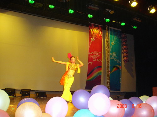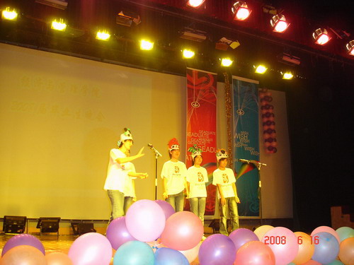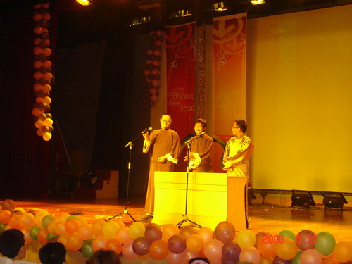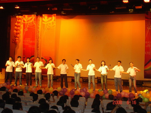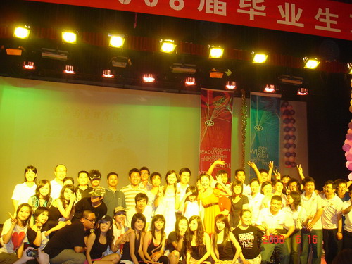 晚会的第一个部分是点歌环节,08届毕业生通过这种方式表达他们对恩师的感激之情,同时,老师和学弟学妹们也表达着他们对毕业生前程的美好祝福。文艺晚会七点正是开始,节目十分精彩,情真意切,感人至深。《炫舞青春》舞出了时代青年的激情和热力;《水姑娘》演绎出了姑娘们的万般风情和青春的旋律;学工办全体老师《我不想说再见》的动情演唱,唱出了对即将离开毕业生的祝愿和不舍;现代舞《舞出人生》表达着青年人的追求时尚和标新立异的性格特征,激情火辣,动感十足;DV+情景剧《永远的画面》是大学四年的一个回顾,从军训开始,把大学生活中的点滴在几分钟内呈现在大家面前,加上煽情的配乐旁白,把离情别绪极大的调动起来了,甚至有些同学感动的热泪盈眶;08年是不平凡的一年,因为奥运会要在首都北京举行,快板《福娃迎奥运》表达了为奥运加油和对北京的美好祝愿……
