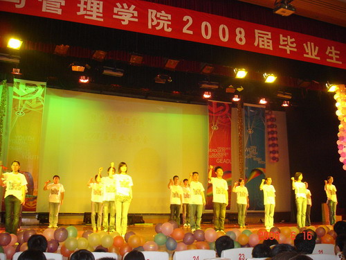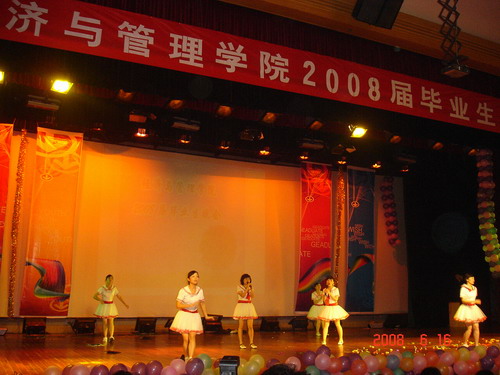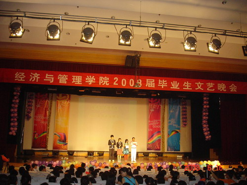 6月15日晚7点,经济与管理学院2008届毕业生文艺晚会在五教大礼堂隆重举行。即将毕业离校、踏入社会的经济与管理学院的学子们通过文艺晚会的形式共同怀念一起走过的四年大学生活,用不同的方式表达他们对大学生活的深情和留恋。校审计处杨华峰处长、校党委组织部王宏副部长,经济与管理学院党总支刘解龙书记、甘为副书记、经济与管理学院叶泽院长等领导出席了本次晚会。经济与管理学院全体辅导员老师和04级各班班主任及部分任课老师也来到晚会现场,一同欢送08届毕业生。