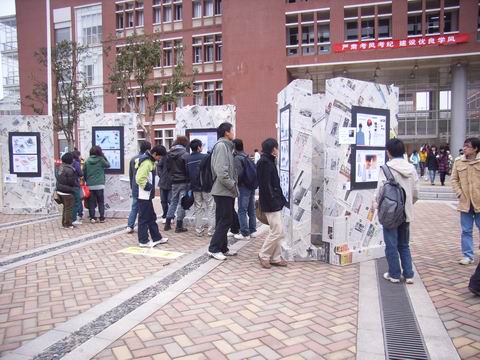 本次工业设计展共展出37件作品,是我院学生参加湖南省首届国际“芙蓉杯”的参赛作品。这些作品充分体现了主题“灾难”与“关爱”,紧贴生活实际,在设计理念中增添了许多人性化成分,处处体现着“关爱”的主题,如安全性强且使用便利的灭火弹、服务周到的送餐机器人等。同学们还别出心裁,在地面上贴上了指示汶川、北川等地震重灾区地理方位的箭头表识,并将展示台部分放倒在地上或摆出相互倚靠的造型,以这种方式突出“灾难”的主题。尽管当日天气寒冷,同学们用心制作的工业设计作品和精心摆放的展示台还是吸引了许多同学在广场上留连不去。在年末之际,其“灾难与关爱”的主题再次唤起了人们对大灾难的回忆,令人感触颇多。我们相信有了这样一个展示的平台,理工学子们也将会有更多的发展空间,我们的课余文化生活也将更加的丰富多彩。