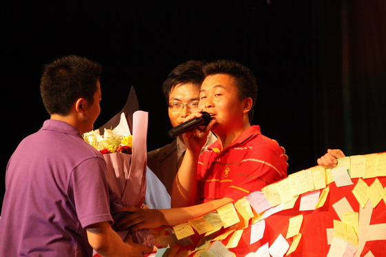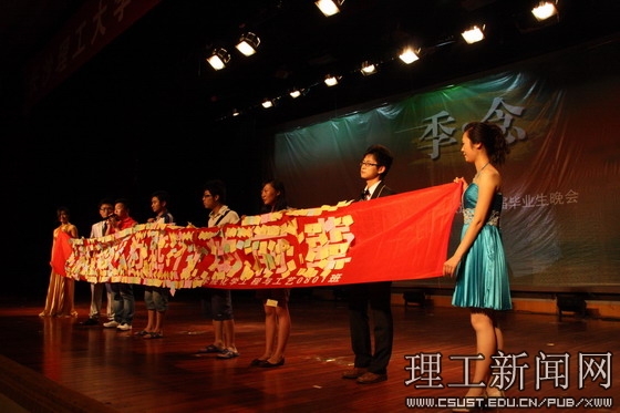 晚会中,当主持人把全校07、08级同学为毕业生们填满祝福的签名横幅展示出来时,在场的观众抑制不住激动的情绪,有的毕业生同学泪流满面,欢笑伴着不舍,泪水带着喜悦。