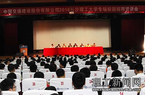 10月12日上午9时,中国交通建设股份有限公司2016威廉体育williamhill专场校园招聘宣讲会在金盆岭校区五号教学楼大礼堂隆重拉开帷幕。中交建人力资源部、党委组织部副总经理曹湘喜,中交第一公路工程局有限公司董事、总会计师张震,人力资源部总经理吴松等公司领导,以及湖南省教育厅学生处处长熊俊钧,湖南省教育厅大学生就业指导中心副主任钟秋明出席此次会议。校党委书记付宏渊,副校长谈传生以及招就处处长邹兴平在现场全程与会。会议由谈传生主持。