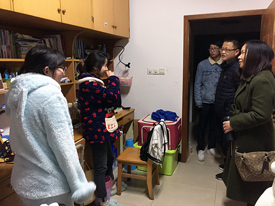 汪功伟一行在实验室、至诚轩四栋、弘毅轩二栋宿舍与学生亲切交流,询问学生是否买到回家车票,何时离校,何时到家。同时,详细了解了同学们的期末考试情况,提醒学生天气逐渐转冷,注意保暖。