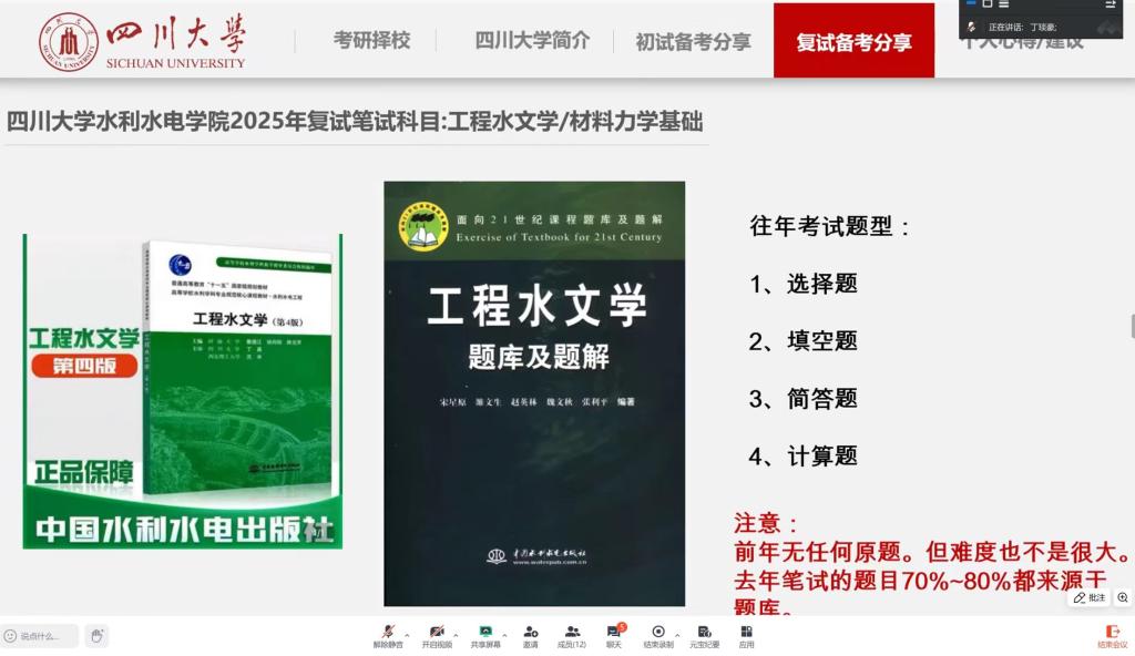 近日,为扎实做好2026届毕业生研究生复试指导工作,水利学院依托腾讯会议平台开展考研复试指导活动。活动充分发挥朋辈引领作用,邀请成功考取河海大学、武汉大学、四川大学、大连理工等高校的优秀学子进行复试经验分享。