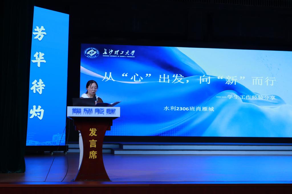 水利类2306班肖雁城同学讲述从心理委员到班长,从学工部助理到年级工作组负责人的成长轨迹,分享了学生干部工作的心得体悟。她通过“寝室矛盾调解”“班级制度创新”“跨部门活动策划”等案例,总结出“态度塑格局、沟通促共赢、团队筑力量、反思助精进”的四大心得。“学生干部工作是一场双向奔赴的修行”,她表示服务他人的过程亦是自我认知与能力突破的旅程。