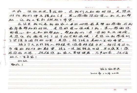 出院前,陈星宇收到了受捐者家属诚挚的感谢信。目前,孩子已完成造血干细胞的移植,状况良好。