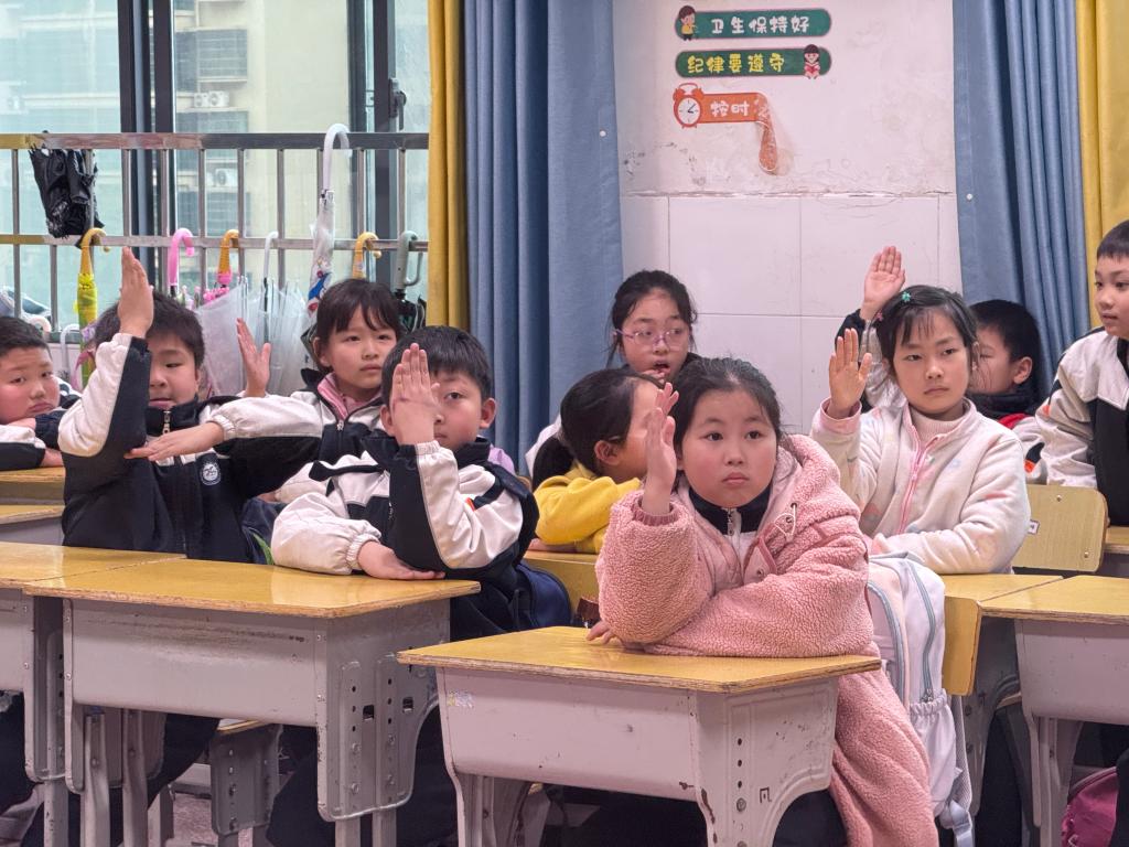 “什么样的食品是‘三无’产品呢?”“生吃蔬菜前要做什么?”学生党员以互动问答形式,一个个贴近生活的问题点燃了现场热情,也向孩子们科普了食品包装标签识别、健康饮食搭配等知识。“食物猜猜乐”游戏中,学生党员通过展示食物图片以及食物特征或营养价值关键词,引导孩子们竞猜食物名称,同步果蔬、谷物等食物的健康益处。“击鼓传花”环节将气氛推向高潮,现场欢笑声与掌声不断。“原来每天吃的食物藏着这么多学问!”一名五年级学生兴奋地说道。