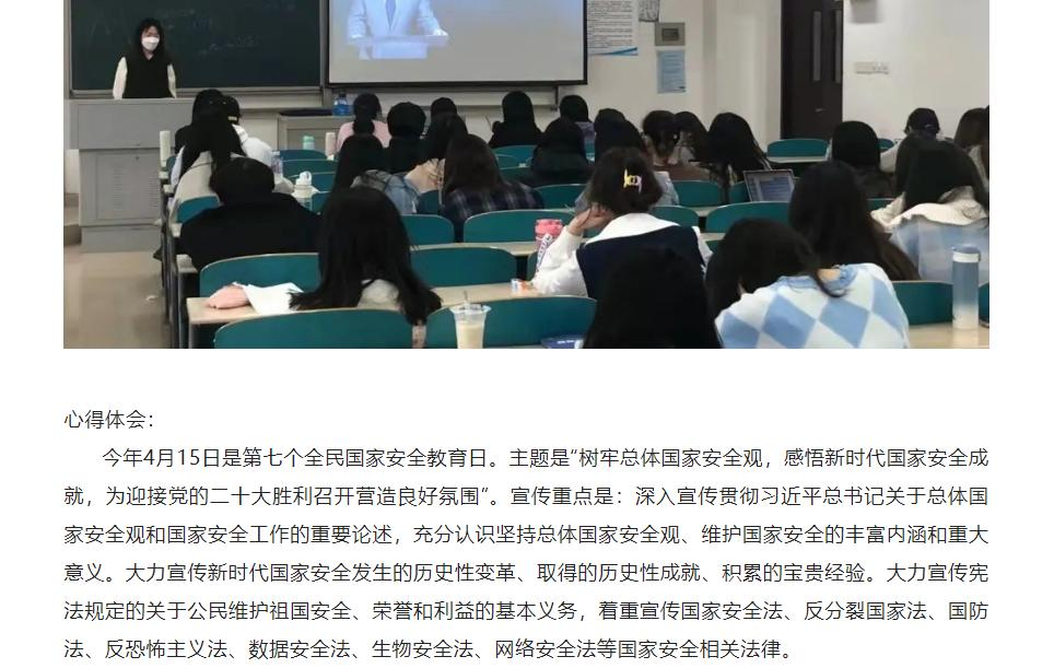 家是最小国,国是千万家。国家安全与每位公民息息相关。今年4月15日是第7个全民国家安全教育日,此次全民国家安全教育日主题为“树牢总体国家安全观,感悟新时代国家安全成就,为迎接党的二十大胜利召开营造良好氛围”。经管学院组织本科生和研究生观看学习了国家安全的相关视频。在观看视频期间,同学们全神贯注,认真学习专家的讲解,并记录下自己的心得与体会。