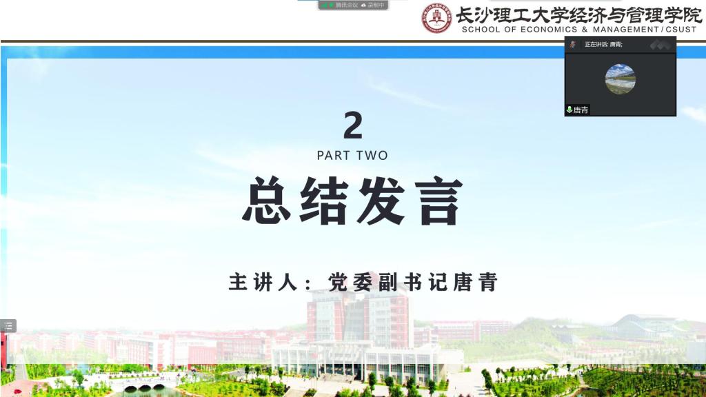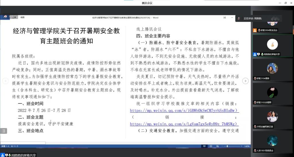为进一步强调学生暑期安全,及时传达安全防范指令,7月26日晚,经管学院通过腾讯会议线上组织召开学生暑期安全教育专题会议,学院党委副书记唐青、辅导员、本研各班班长参加,会议由学工办主任周路路主持。