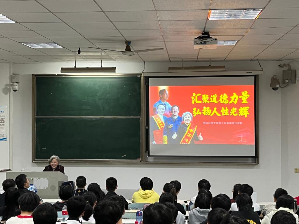 10月27日下午,马克思主义学院在金盆岭校区6教107开展主题为“榜样引领,道德润心—榜样人物进思政课堂”系列活动。此次活动邀请到了全国道德模范、国防科技大学电子科学学院高级会计师任菲莉进行交流分享。此次活动由郭华老师主持,思政课堂全体学生参加了此次活动。