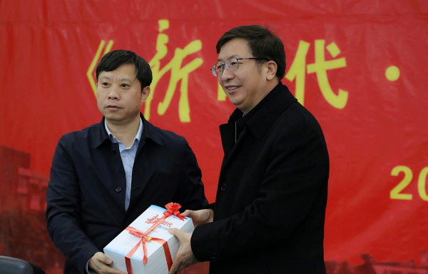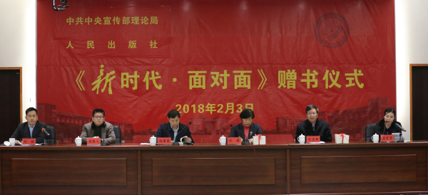 赠书仪式上,中宣部理论局副局长赵勇富、研究处副处长候军,人民出版社纪委书记王彤发表了讲话,介绍了撰写出版情况,提出了希望要求。赵勇富指出,《新时代面对面》作为理论热点面对面系列丛书的最新读本,主题鲜明,内容针对性强,该书以习近平新时代中国特色社会主义思想为指导,关注的问题紧密联系新时代中国特色社会主义生动实践,紧密联系干部群众思想实际,观点权威准确,语言通俗易懂,文风清新简洁,文字、图片、音频呈现出立体结构,使读本既增加了可读性,也体现了时代性,充满了凝聚社会共识、提升理论自信的智慧。他希望学校把读本的学习向深入推进,全面准确理解党的十九大精神,切实把思想和行动统一到党中央决策部署上来。