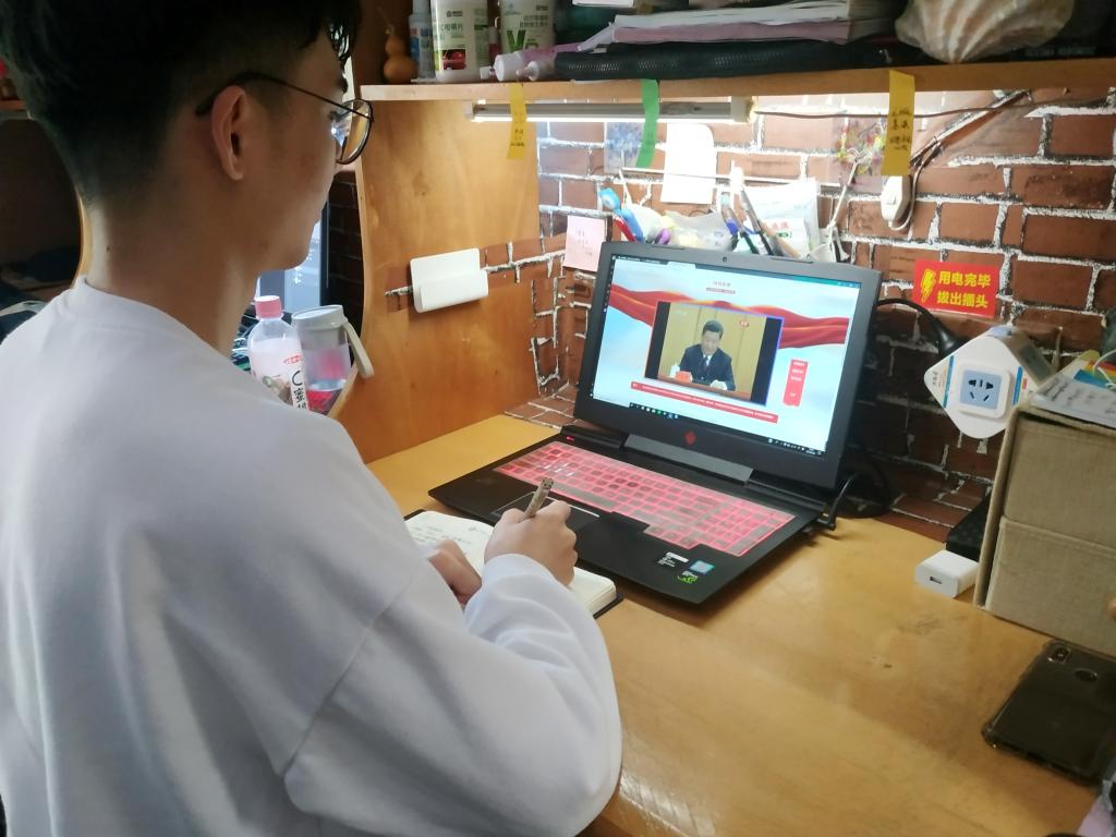 学生在宿舍收看纪念五四运动100周年大会直播