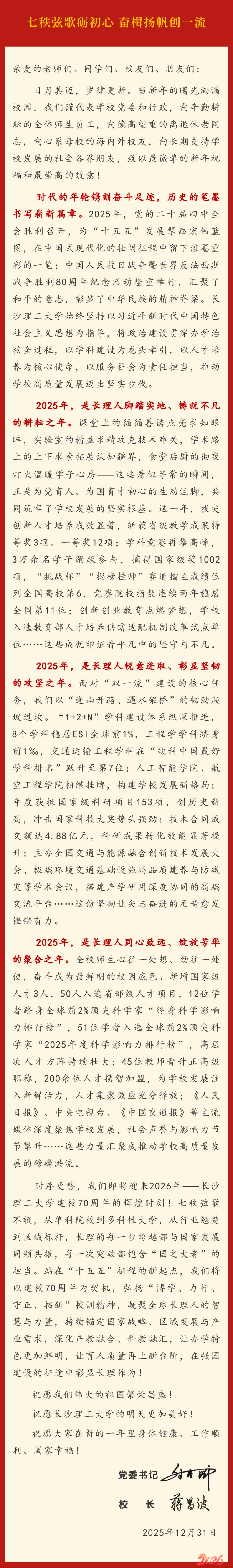 七秩弦歌砺初心 奋楫扬帆创一流——威廉体育williamhill2026年新年献词