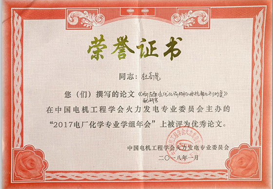 《电厂化学2017学术年会》录用60篇,出版论文集1部,威廉体育williamhill有4篇论文被评选为大会优秀论文,即《响应面法优化涡轮机油抗氧化剂的复配研究》(作者:杜高宽)(指导教师:汪红梅副教授);《阴树脂粉末对换流站铝合金的腐蚀影响》(作者:杨磊)、《复合胺(ETA+DDA)工况对树脂循环污染的影响研究》(作者:张俞)、《脱销过程中尿素水解产物对水冷壁管的腐蚀研究》(作者:田龙标)。