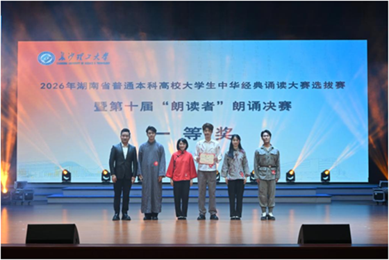 4月20日晚,云塘校区大会堂灯火璀璨、座无虚席,2026年 “一校一书——经典、精读、经世”阅读推广活动启动仪式在此举行。湖南省政协委员、湖南省图书馆学会理事长邹序明,湖南省高校图工委秘书长、湘潭大学图书馆馆长龚蛟腾,中华诗词学会朗诵艺术委员会专职委员吕铭,校学工部、研究生院、教务处、团委等单位相关负责人出席活动。湖南省普通高校大学生中华经典诵读选拔赛暨学校第十届“朗读者”朗诵决赛也同时精彩上演,以书香铸魂、以文化育人,为校园注入蓬勃向上的青春力量。