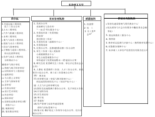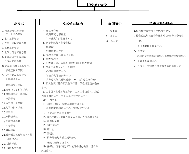 学校设有23个教学学院(含1个独立学院、1个继续教育学院)及设置了19个党政管理机构、3个群团组织、7个教辅及其他机构,其中党政管理机构有党政办公室、党委组织部、学生工作部(处)、学科建设与发展规划处、研究生院、教务处、国际交流处、计划财务处、审计处、基建处、资产管理与实验室建设管理处等;群团组织有校团委、校工会、关工委;教辅及其他机构有图书馆、后勤服务中心、教学质量监测与评估中心(教师教学发展中心)、信息化建设管理与现代教育中心等。