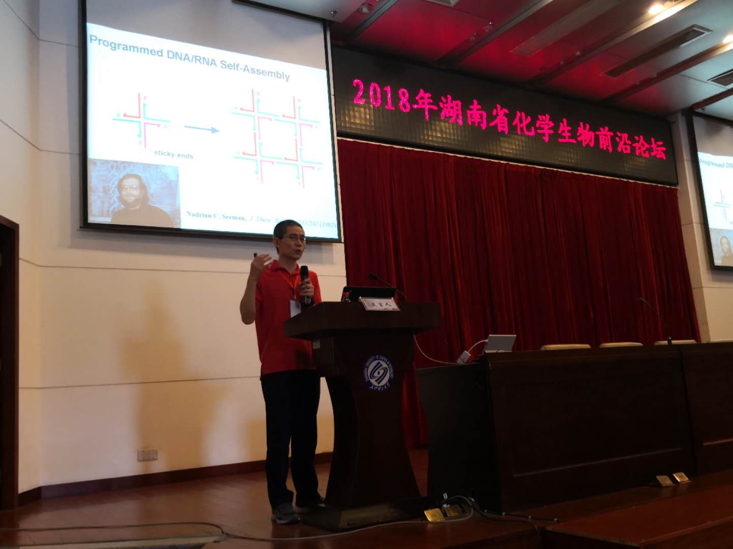 国际著名生物纳米专家,美国普渡大学毛成德教授作了In Vivo Production of Designed RNA Nanostructures的报告,阐述了核酸折纸技术的基本理论,并详细介绍了体内原位合成RNA纳米结构的研究进展;英国皇家化学会《Analytical Methods》杂志副主编、加拿大滑铁卢大学刘珏文教授作了“核酸-纳米材料表界面研究”报告;国家“973”项目首席专家、国家杰出青年基金获得者樊春海教授作了“基于框架核酸的界面调控与生物分析应用”报告,系统介绍了他近期发表在Nature上的最新成果;国家杰出青年基金获得者、教育部“长江学者”奖励计划特聘,清华大学刘冬生教授作了“基于框架诱导组装的模块化纳米载药体系”报告,国家杰出青年基金获得者刘志洪教授作了“上转换荧光分析”报告、国家杰出青年基金获得者汪乐余教授作了“高性能纳米探针:设计、构筑与分析应用”报告,国家杰出青年基金获得者复旦大学张凡教授作了“近红外光学活体多重成像分析”报告,国家杰青北京大学要茂盛教授作了“Detection of Living System Biomarker Using BioSTAND”的报告;国家优青、青年长江湖南大学袁荃教授作了“无背景纳米生物分析方法研究”的报告。这些精彩纷呈的学术报告充分展示了在化学、生物、医药、纳米材料、环境、化工等研究方向与学科领域的最新研究进展与应用前景。