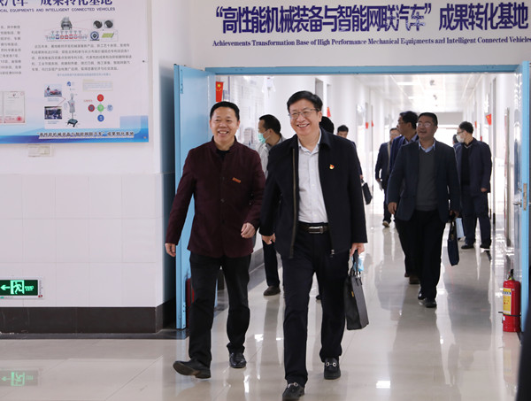 图为校党委书记付宏渊、校长曹一家一行在汽机学院参观科研成果转化基地