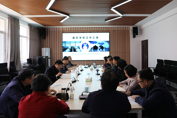 图为校党委书记付宏渊、校长曹一家一行在国际学院调研