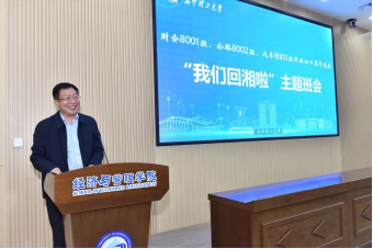 在经管大楼100报告厅,校友们举行了一场别开生面的“我们回湘啦”主题班会,校党委书记付宏渊、副校长谈传生、10名授课教师代表、校友中心和相关学院负责人出席,公路8002班校友张晓冰担任主持。观看学校宣传片《逐梦》后,谈传生在致辞中代表学校校友总会对重聚母校的校友表示热烈欢迎,向各位校友毕业四十年致以诚挚祝贺。随后,当年的授课教师代表高纯一老师回忆了与校友们共度的学习生涯,表达了见证校友们成长成功的喜悦心情。校友代表丁安华、劳军、黄腊泉、汪继泉、李国忠分别发言,畅谈自己的经历和感悟,并对母校的育人事业发展建言献策。校友们为表达对母校的感恩之情,向学校教育基金会捐赠10万元。