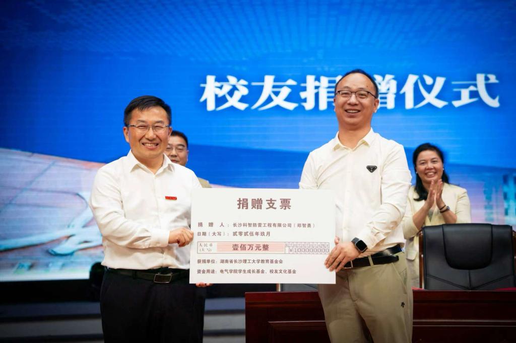 9月23日,电气与信息工程学院1999届校友、长沙科智防雷工程有限公司董事长兼总经理郑智勇捐赠仪式在2025级新生“电苑第一课”现场举行。副校长张军辉出席并讲话,校友中心、教育基金会、学工部、校团委、电气学院等相关单位负责人参加。张军辉代表学校向郑智勇先生致以感谢。他表示,“校友的成就,是母校最骄傲的名片;校友的回馈,是对教育最深情的反哺。”他鼓励全体新生以优秀校友为榜样,珍惜韶华、锤炼本领,成长为具有...