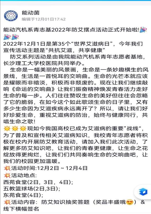 2022年12月1日是第35个“世界艾滋病日”,由卫健办联合两校区学生社团“爱心中转站”和城南学院能动汽机系青年志愿者基地在两校区开展了以“共抗艾滋,共享健康”为主题的大型防艾抗艾知识宣教活动,引导学生学习掌握艾滋病预防知识,对艾滋病的传播保持警惕,提高自我保护能力,做自己健康的第一责任人。