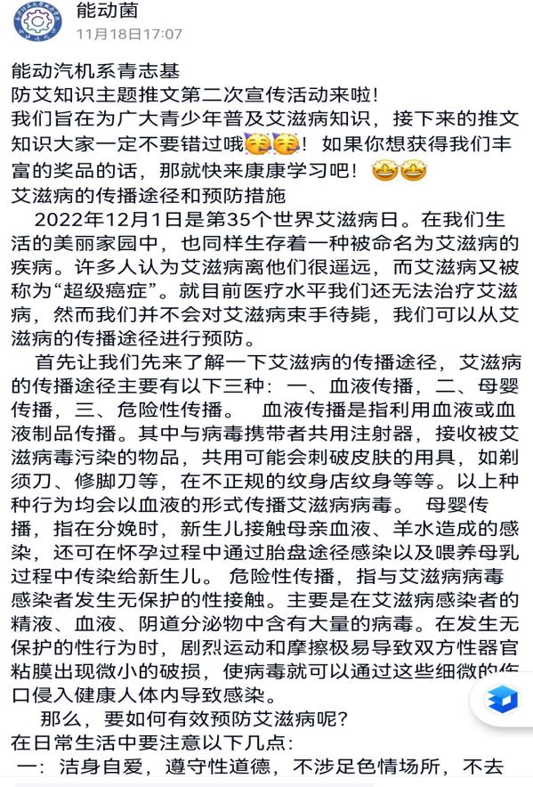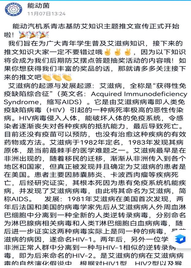 城南学院青年志愿者基地开展线上防艾知识推文。同学们将防艾主题的知识推文通过能动汽机系的官方QQ发送,包括如下一些内容:(1)艾滋病的定义和起源(2)艾滋病的传播途径和预防措施(3)艾滋病的危害和阻断措施(4)关爱艾滋病病人。这四篇知识推文都是社团骨干自己搜集,整理,由雷鹂老师审核指导再发布的。同学们在这个过程中更深刻了解了艾滋病的知识,起到了引领和自我教育的作用。